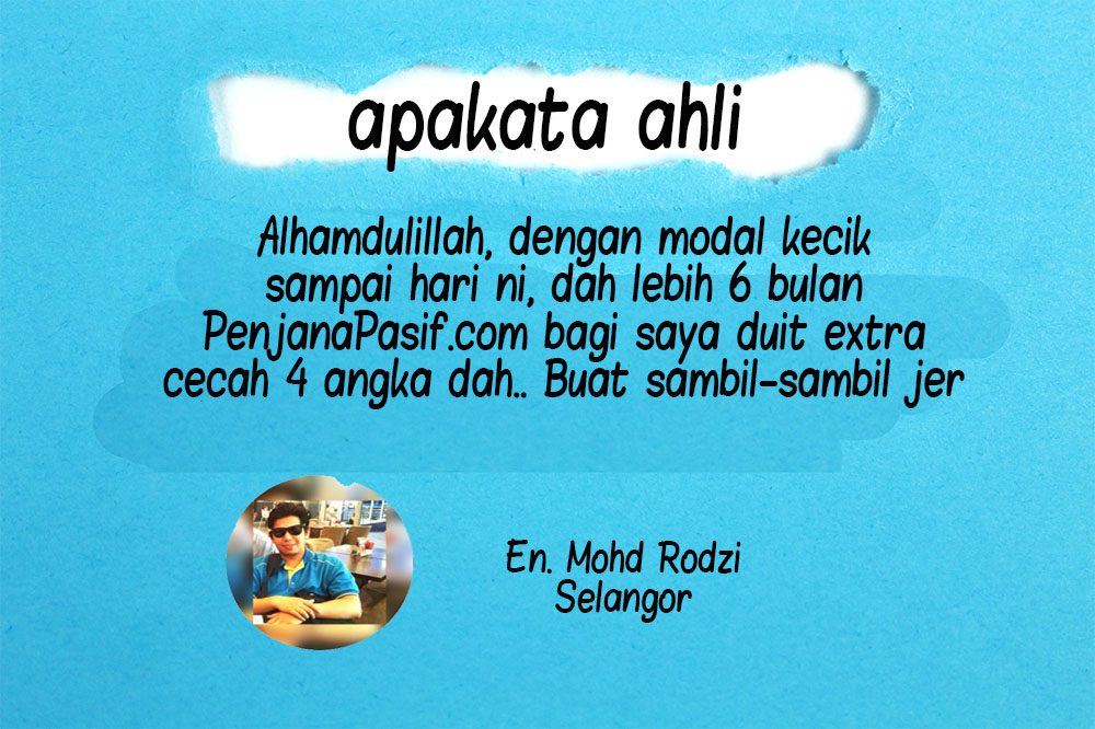 Pada hari ini, segalanya memerlukan duit. Tapi duit bukanlah segalanya. Program PenjanaPasif ini adalah bakti saya kepada masyarakat, supaya SAYA, ANDA dan rakyat Malaysia sentiasa menjadi orang yang mahu mengubah taraf hidup kepada yang lebih baik. Sentiasa berfikiran positif dan bergerak ke depan. Dengan modal sekecil RM20, saya sebenarnya memberi anda sedikit "push"atau dorongan untuk melangkah sedikit demi sedikit, menjadi insan yang lebih kaya dan berjaya.