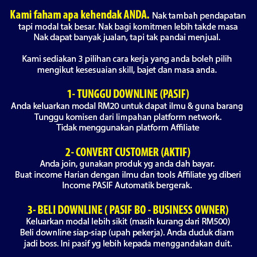 Anda dah excited nak join kan? Nak start buat income RM50-RM500 sehari? Baik.. ada 3 pilihan modal dan cara kerja yang boleh anda pilih untuk join PenjanaPasif.com